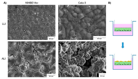 (A) Scanning electron microscopy of 16HBE41o- and Calu-3 cultivated in the liquid–liquid interphase (LLI) or air–liquid interphase (ALI) for 3 weeks after seeding. When cultivated under ALI conditions, unlike 16HBE41o-, Calu-3 cells produce mucus and form microvilli. For all pictures, the scale bar corresponds to 20.0 µm. (B) Transition from LLI culture to ALI allowing cell differentiation and in some case, depending on the cell line, mucus production.