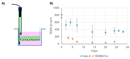 (A) Transepithelial electrical resistance (TEER) measurement using a Transwell and an electrode. (B) Evolution of TEER in Calu-3 and 16HBE41o- when cultivated in ALI conditions. Cells are seeded in a Transwell (150,000 cells per insert) and cultivated in LLI conditions for one week. Then, the apical media are removed. TEER is monitored for 25 to 30 days. Data are averages of at least three Transwells and are expressed in Ω·cm2. Calu-3 exhibits a higher TEER value, demonstrating its ability to form TJ under this condition.