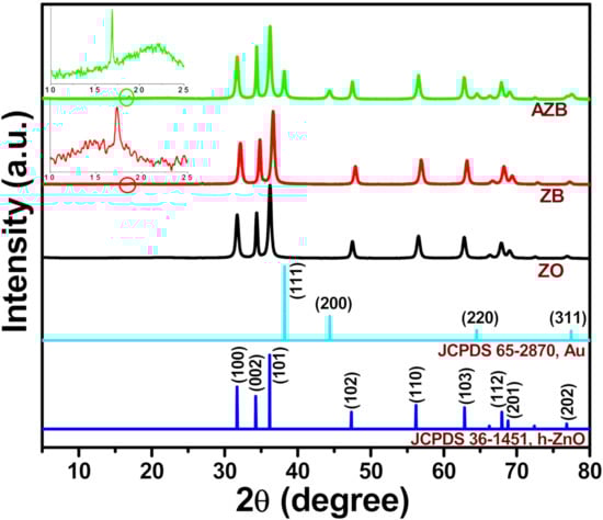The crystalline phases of the ZO, ZB, and AZB samples were determined from their XRD profiles as depicted in Figure 1. The XRD reflection peaks of the as synthesized ZO, ZB, and AZB centered at 31.62°, 34.27°, 36.21°, 47.41°, 56.50°, 62.70°, 67.81°, 68.97°, and 76.93° correspond to the (100), (002), (101), (102), (110), (103), (112), (201), and (202) diffraction planes, respectively, which are consistent with the hexagonal ZO (h-ZO) structure (Joint Committee on Powder Diffraction Standards (JCPDS) 36-1451) [23]. Moreover, some additional peaks were observed at approximately 38.05°, 44.25°, and 64.54° for the AZB sample, which contained the (111), (200), and (220) crystal planes of cubic Au NPs (JCPDS 65-2870) [26]. These results confirmed the successful formation of Au NPs without using any surfactants, during which BP acted as a green reductant. The enlarged spectra of the ZB and AZB samples contain an additional peak at 17.15°, which corresponds to the (020) lattice plane of BP [27]. Therefore, the results of the XRD measurements confirmed the successful preparation of the ZO, ZB, and AZB samples.