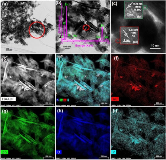 Characterization of the AZB sample. (a) TEM image of the AZB sample. (b) Enlarged TEM image of the marked region in the panel of (a). Inset displays the energy-dispersive X-ray spectrum of the AZB sample. (c) HRTEM image of the marked region in the panel of (b). Insets (c1) and (c2) display the HRTEM images of ZO and Au NPs, respectively. (d) High-angle annular dark-field (HAADF) image of the AZB sample and elemental maps of (e) the AZB composite, (f) Au, (g) Zn, (h) oxygen (O), and (i) phosphorus (P).