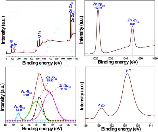 Figure 3 illustrates the XPS spectra of the representative AZB sample, which were recorded to determine the surface chemical composition and valence state of the constituent elements. The XPS survey spectrum displayed in Figure 3a indicates the presence of Au, P, Zn, and O elements. The Zn 2p, Au 4f, and P 2p peaks are shown in Figure 3b–d, respectively. The two relatively strong peaks centered at 1021.9 and 1045.0 eV in Figure 3b were assigned to the binding energies of the Zn 2p3/2 and Zn 2p1/2 states, respectively [23]. Moreover, the calculated difference (~23.1 eV) between the Zn 2p3/2 and Zn 2p1/2 binding energies corresponded to the Zn2+ valence state [23], while Figure 3c confirmed the formation of metallic Au NPs in the AZB sample. In particular, its two peaks are centered at approximately 83.45 and 87.81 eV, which represent the binding energies of the Au 4f7/2 and Au 4f5/2 states, respectively [28]. However, the two other XPS peaks obtained by Gaussian fitting have binding energies of approximately 88.90 and 91.35 eV, which correspond to the Zn 3p3/2 and Zn 3p1/2 states, respectively [28]. Finally, the P 2p peak is displayed in Figure 3d. Therefore, the obtained XPS data are in good agreement with the XRD (Figure 1) and TEM (Figure 2) results, which suggest the successful formation of the AZB nanocomposite.