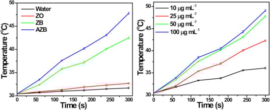 Photothermal temperature measurement. (a) Photothermal temperature increase observed for pure water and ZO, ZB, and AZB samples under NIR light irradiation. (b) Photothermal temperature increment observed for the AZB samples with different concentrations (the data are shown as the mean of triplicates).