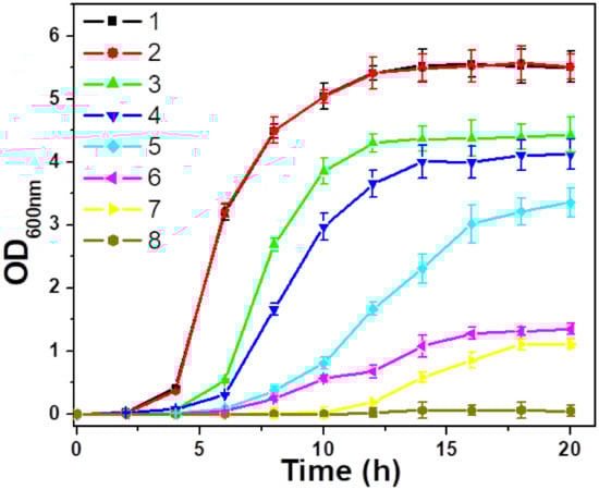 Growth curves of S. aureus species subjected to different treatments: (1) blank (control); (2) NIR; (3) ZO; (4) ZO + NIR; (5) ZB; (6) ZB + NIR; (7) AZB; and (8) AZB + NIR. The concentration of each nanomaterial (ZO, ZB, and AZB) was 25 μg mL−1 (the data are shown as the mean of triplicates).