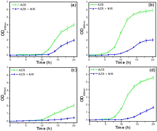 Proposed antibiotic samples with controls are divided into eight groups: (1) blank (control), (2) NIR, (3) ZO, (4) ZO + NIR, (5) ZB, (6) ZB + NIR, (7) AZB, and (8) AZB + NIR. To measure the antibacterial activity of the proposed antibiotics, the prepared bacterial cells of S. aureus ATCC 25923 and MRSA strains were seeded into a 96-well plate with the above categorized samples to a final concentration at 25 and 50 µg mL−1, respectively. In groups (2), (4), (6), and (8), cells were irradiated by the 808 nm laser with a power of 2.5 W at a 5 cm distance for 5 min before the cultivation. Bacterial growth for 20 h at 37 °C with 500 rpm was monitored by measuring the absorbance at a wavelength of 600 nm (OD600) using a spectrophotometric microplate reader (BMG LABTECH GmbH, Ortenberg, Germany).