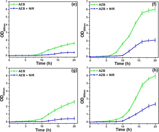 Effect of NIR on antibacterial activity of AZB. Growth curves of (a) MRSA1, (b) MRSA2, (c) MRSA3, (d) MRSA4, (e) MRSA5, (f) MRSA6, (g) MRSA7, and (h) MRSA8 cells subjected to the AZB and AZB + NIR treatments. The concentration of each AZB nanomaterial was 50 μg mL−1 (the data are shown as the mean of triplicates).