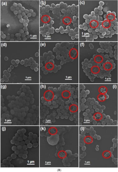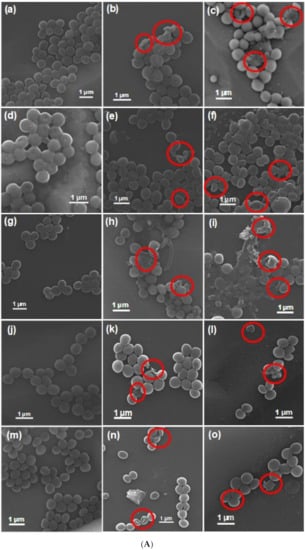 SEM images of bacterial cells after various treatments. (A) Untreated (a) S. aureus, (d) MRSA1, (g) MRSA2, (j) MRSA3, and (m) MRSA4. AZB-treated (b) S. aureus, (e) MRSA1, (h) MRSA2, (k) MRSA3, and (n) MRSA4. AZB + NIR-treated (c) S. aureus, (f) MRSA1, (i) MRSA2, (l) MRSA3, and (o) MRSA4. (B) Untreated (a) MRSA5, (d) MRSA6, (g) MRSA7, and (j) MRSA8. AZB-treated (b) MRSA5, (e) MRSA6, (h) MRSA7, and (k) MRSA8. AZB + NIR-treated (c) MRSA5, (f) MRSA6, (i) MRSA7, and (l) MRSA8. Disrupted cell membrane regions by treatments are indicated by the red circles.