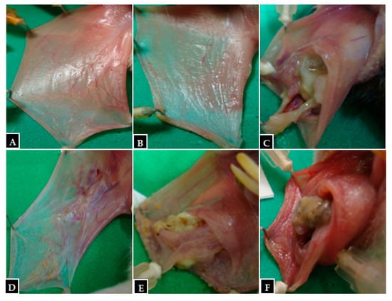 On the 10th day, the oral mucosa was exposed and evaluated in a single-blinded fashion and graded as follows: Score 0: completely healthy mucosa, without erosion or vasodilation. Score 1: the presence of erythema, with no evidence of mucosal erosion. Score 2: severe erythema, vasodilation, and superficial erosion. Score 3: formation of ulcers on one or more faces, affecting no more than 25% of the mucosal surface area, severe erythema, and vasodilation. Score 4: cumulative ulcer formation, reaching approximately 50% of the mucosal surface area. Score 5: complete ulceration, making it impossible to expose the mucosa [16,39].