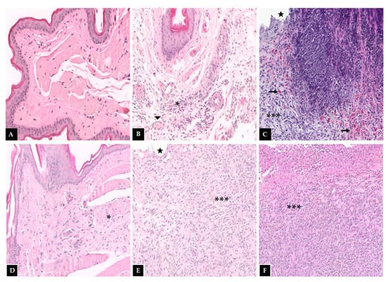Histopathological examination of the hamster oral mucosa. OM was induced by 5-FU and MT, treated with PLGA-DEX NPs. (A) Normal group: animals without histopathological changes in oral mucosa. (B) Trauma group: animals subjected to the induction of excoriations in the oral mucosa, without OM; there are blood vessels (triangle) and a small region of inflammatory infiltrate (an asterisk) dispersed in the conjunctive. (C) Group 5-FU: animals with untreated OM, characterized by the presence of ulcers (star), intense inflammatory infiltrate (three asterisks), and hemorrhagic foci (arrow) dispersed throughout the region. PLGA-DEX groups (D) 0.1 mg/kg, (E) 0.5 mg/kg, (F) 1 mg/kg: animals with OM treated with DEX-loaded PLGA NPs. The groups treated with PLGA-DEX NPs 0.5 and 1 mg/kg presented intense inflammatory infiltrate (three asterisk) and ulcers (star). The group treated with PLGA-DEX NPs 0.1 mg/kg presented a reduction in inflammation, marked by a decrease in inflammatory infiltrate (an asterisk).