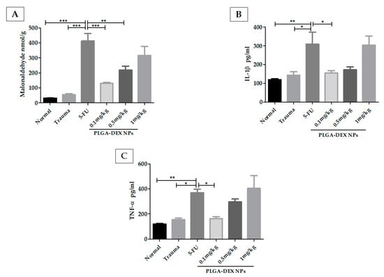 MDA (Figure 4A) was elevated in the 5-FU group, compared to the normal and trauma groups. Comparison of the 5-FU group with the PLGA-DEX NPs 0.1 mg/kg and 0.5 mg/kg group showed a statistical difference, (*** p < 0.001; ** p < 0.01).