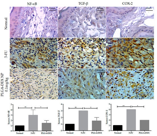 The 5-FU group showed higher immunostaining (score 3) for nuclear factor kappa B (NF-κB) than the normal animals (score 1) and the group treated with PLGA-DEX 0.1 mg/kg (score 1.5), whose reduction in immunostaining was observed (* p < 0.05 Vs. 5-FU group). The 5-FU animals showed more intense labeling for transforming growth factor-beta (TGF-β) (score 3), while the PLGA-DEX group presented intermediate values (score 1.5) (* p < 0.05 vs. 5-FU group), and the lowest score was observed in the normal group (score 1). Statistical differences were found between the groups for the expression of COX-2; the 5-FU group showed the greater intensity of marking (score 4) compared to the groups PLGA-DEX NPs 0.1 mg/kg (score 2) (* p < 0.05 vs. 5-FU group) and normal (score 1) (Figure 5).