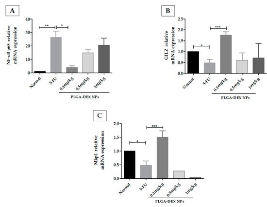 Treatment of OM with PLGA-DEX NPs 0.1 mg/kg reduced mRNA expression of NF-κB compared to the 5-FU group, showing an expression close to that of the normal group. PLGA-DEX 0.5 mg/kg or 1 mg/kg treated groups did not show a significant reduction in NF-κB compared to animals that received only 5-FU (Figure 6A). The PLGA-DEX 0.1 mg/kg treated group showed increased gene expression of mitogen-activated protein kinase phosphatase 1 (MKP1) (Figure 6B) and the glucocorticoid-induced leucine zipper (GILZ) (Figure 6C), compared to the 5-FU group. Animals treated with NP at a dose of 0.5 mg/kg or 1 mg/kg did not show an increase in the concentration of MKP1 or GILZ mRNA, compared to the 5-FU group (* p < 0.05; ** p < 0.01; *** p < 0.001).