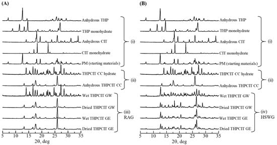 Overlay of powder XRD patterns of materials and experimental samples: (i) anhydrous and hydrate forms of THP and CIT, physical mixture of anhydrous THP and CIT (PM; starting materials); (ii) reference THPCIT cocrystals (CC; objective compounds); (A) (iii) wet and dried granules prepared by resonant acoustic granulation (RAG); and (B) (iv) the granules prepared by high-shear wet granulation (HSWG). Granulation was performed using water (GW) or ethanol (GE).