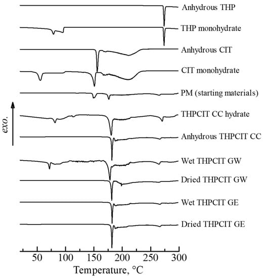 DSC heating curves of: anhydrous and hydrate forms of THP and CIT, physical mixture of anhydrous THP and CIT (PM; starting materials), reference THPCIT cocrystals (CC; objective compounds), and wet and dried granules prepared by resonant acoustic granulation (RAG) using water (GW) or ethanol (GE).