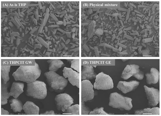 SEM images of anhydrous THP, the physical mixture (THP, CIT, and HPC bulk powder), and granules were taken by a JSM-6510LV (JEOL, Tokyo, Japan) for the morphological analysis. Samples were sprinkled on aluminum stubs with carbon tape and imaged. The acceleration voltage, magnification, and working distance were 1.0 kV, ×150, and 15 mm, respectively.