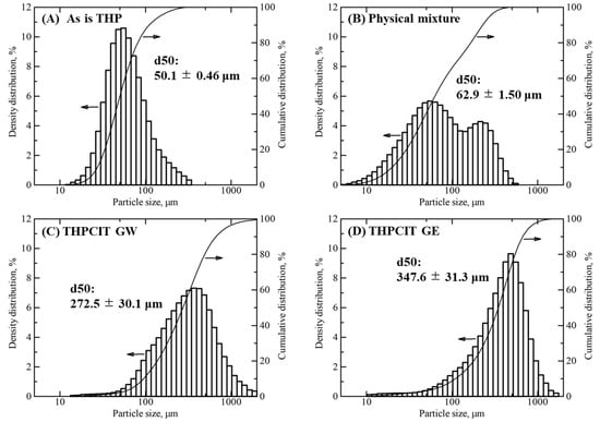 Volume-based particle size distribution (PSDs) and median diameters (d50): (A) “As is” THP, (B) a physical mixture consisting of THP, CIT, and HPC bulk powder, (C) dried THPCIT granules using water (GW), and (D) the granules using ethanol (GE) prepared by RAG. The value of d50 is given in the figure (mean ± SD; n = 3).