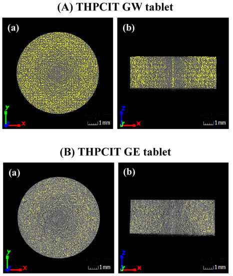 The image scanned by X-ray CT was used to analyze the internal density in the tablets compressed from RAG granules. As shown in Figure 6A, the GW tablet was mapped as a yellow color, suggesting a high-density characteristic. The image also exhibited a high-density area in the outer portion of the tablet, whereas the center of the tablet was less dense. As explained earlier, the dried GW granule contained a fine particle fraction due to dehydration of the cocrystal hydrate. It has been reported that fine particles contribute to the formation of tablets with higher density [42,43]. In the case of the GE tablet, the image revealed that the density was lower than that of the GW tablet because there was no phase transition (Figure 6B).