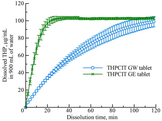 The dissolution behavior of the GW and GE tablets in aqueous medium was compared (Figure 7). In both tablets, the disintegrated sample was completely dissolved, and the concentration of THP reached almost 100% (104.44 μg/mL) at the final timepoint (120 min). However, the dissolution of the GW tablet was significantly slower than that of the GE tablet, because of the longer disintegration time (Table 2). The rate-determining step in the disintegration of porous tables is the liquid penetration [44]. Thus, the penetration in the GW tablet was hindered because of the high-density structure.