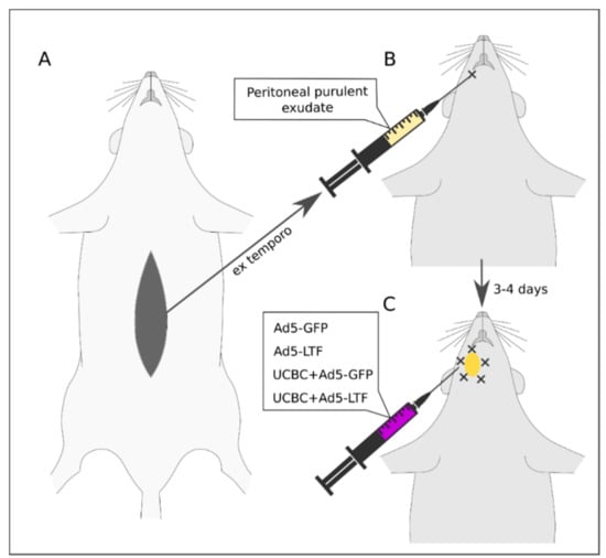 Experimental design. A—Acute peritonitis modeling. B—Phlegmon modeling by injection of the purulent peritoneal exudate in the molar region of the medial surface of the mandible. C—Introduction of one of the preparations after the maturation of the abscess.