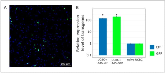 Expression of transgenes in UCBC 72 h after transduction with Ad5-LTF or Ad5-GFP (multiplicity of infection (MOI) = 10). (A)—fluorescence microscopy shows a specific green signal in UCBC + Ad5-GFP. Cell nuclei were stained with Hoechst 33342. (B)—quantitative analysis of LTF and reporter gfp genes expression level in UCBC + Ad5-LTF and UCBC + Ad5-GFP in comparison with naïve UCBC. Data are presented as mean ± standard error, * p < 0.05.