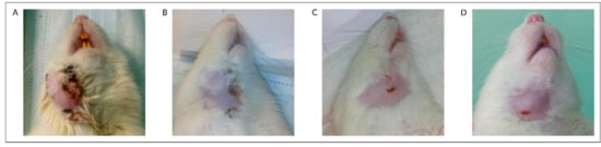 Phlegmon regression. (A)—Rat from the control group (Ad5-GFP) on the fourth day of treatment. (B)—Rats seven days after injection of UCBC + Ad5-GFP. (C,D)—Rats from the Ad5-LTF and UCBC + Ad5-LTF groups on the sixth day of treatment.