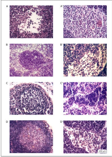 In the therapeutic groups, more preserved and activated lymphatic tissue was documented. Decrease of the necrotic mass area to 65.23% ± 0.63% in the UCBC + Ad5-GFP group (Figure 4B,B’) and to 63.82% ± 1.86% in the Ad5-LTF group (Figure 4C,C’) was observed (Figure 5). In the preserved lymphoid tissue, structural components (lymphoid follicles and sinuses) were observed. Lymphoid follicles were predominant without germinal centers or attenuated type. Morphological changes in the UCBC + Ad5-LTF group showed a significant decrease in the area of necrotic mass to 52.97% ± 1.58% and the preservation of structured lymph node tissue. Follicular and paracortical hyperplasia, as well as sinus histiocytosis, were observed (Figure 4D,D’). The follicles were enlarged, with large light germinal centers, in which the mitotic activity was increased, and macrophages appeared.
