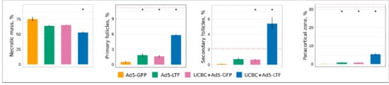 Results of morphometric analysis of rat cervical lymph nodes. Bar plots with error bars illustrate destruction (necrotic mass), preservation (primary follicles and paracortical zone) and activation (secondary follicles) of lymph nodes from the control (Ad5-GFP) and therapeutic (Ad5-LTF, UCBC + Ad5-GFP, and UCBC + Ad5-LTF) groups. Data are presented as mean ± standard error. The dotted lines correspond to the average relative area in intact rats. * p < 0.05 in comparison with the Ad5-GFP group.