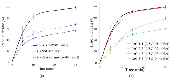 NSC tablet comprising a 1:3 composition ratio of DUT and silica carrier (NSC-03 tablet containing lipid), NSC tablet without lipid (NSC-07 tablet), and physical mixture tablet without lipid (physical mixture-07 tablet), were prepared. The released content of DUT at 30 min from the start of the dissolution test was determined for these tablets. As shown in Figure 5a, the dissolution rate of DUT in NSC-03 tablet (containing lipids) was 99.6 ± 2.9%, in NSC-07 tablet (containing no lipids) was 68.7 ± 2.8% and in physical mixture-07 was 58.4 ± 2.5%. Therefore, it could be inferred that in the presence of lipids, the dissolution rate of DUT in NSC tablets improved by approximately 1.4 to 1.7 times. In addition, the dissolution rate of DUT also increased in the physical mixture (NSC-07) tablet containing no lipids prepared using the solvent dropping method. Therefore, it could be concluded that the dissolution rate of DUT varies according to the manufacturing method.