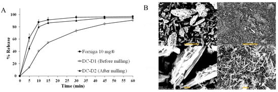 (A) Dissolution profiles of the DC-D1 tablet before and after milling of the dapagliflozin (DAP) cocrystal in pH 1.2. (B) SEM images of a DAP cocrystal before (left) and after (right) milling at two magnifications: 500 (top) and 2000 (bottom). Each value represents the mean ± standard deviation (n = 6).