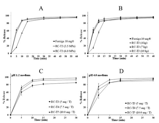 Effect of manufacturing parameters on the dapagliflozin (DAP) dissolution profiles. (A) Roller pressures (3.5 Mpa and 6.0 Mpa) with RC-T3 formulation with pH 1.2. (B) Tablet hardness (4 kp, 7 kp, and 10 kp) with RC-T3 formulation in pH 1.2, and Crospovidone contents (RC-T3, T4, T5) in (C) pH 1.2 and (D) pH 4.0. The experiment was conducted in USP Apparatus 1 at 50 rpm and in 900 mL dissolution media at 37.0 °C. Each value represents the mean ± standard deviation (n = 6).