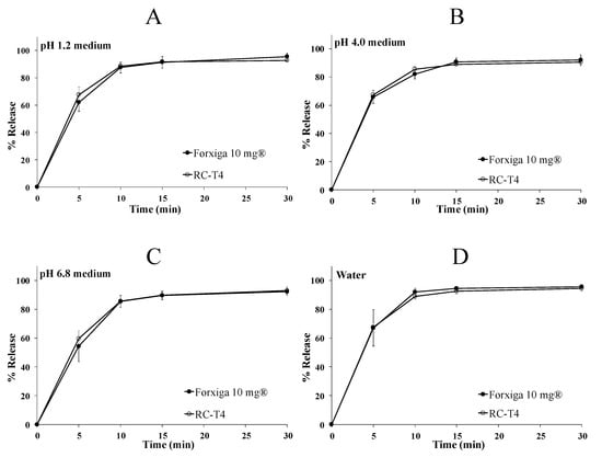 Dapagliflozin (DAP) dissolution profiles from Forxiga® 10 mg and RC-T4 in pH 1.2 (A), pH 4.0 (B), pH 6.8 (C), and distilled water (D). The experiment was conducted in USP Apparatus 1 at 50 rpm and in dissolution media at 37.0 °C. Each value represents the mean ± standard deviation (n = 6).