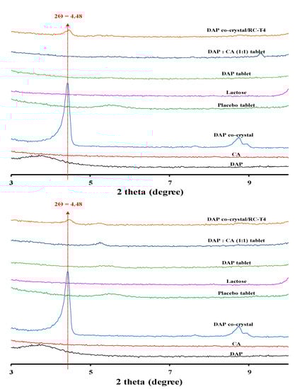 XRD analysis for identifying the cocrystal structure preservation in the tablet is shown in Figure 4. The results showed that a peak of 4.48°, the characteristic signal of the cocrystal structure, was observed in RC-T4 after accelerated and long-term storage conditions. The peak intensity of 4.48° was maintained for 6 months during the stability test period, indicating that the DAP cocrystal structure did not change, and hydrogen bonding remained in spite of the surrounding excipients.