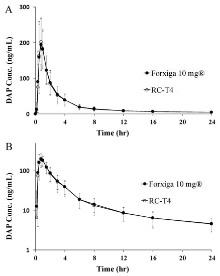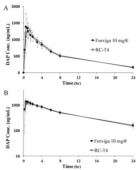 Average plasma concentration vs. time profiles of DAP after oral administration of Forxiga® 10 mg (●) and RC-T4 (○) in beagle dogs ((A): linear scale, (B): semilog scale). Values are presented as the mean ± standard deviation (n = 12).