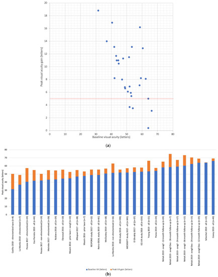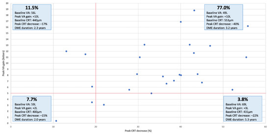 Of the 22 studies retained, only those assessing both functional and anatomical efficacy were used for this analysis (n = 18 studies) [26,27,28,29,30,32,33,34,35,36,37,38,39,40,41,42,43,44,45]. Functional efficacy was defined as a BCVA improvement of at least five letters, while anatomical efficacy as a CRT decrease by 20% or more (Figure 4) similarly to the definitions used by the DRCRnet study group [47,48]. Mean follow-up duration for these studies was 20.0 months (range: 8.5–36.0 months, median: 18.0 months). An anatomical-functional correlation was seen in 77.0% of the studies with a mean CRT decrease of −40.5% from baseline (range: −27.9–−55.8%, median: −40.0%) and a mean BCVA gain of +10.1 letters (range: +5.0–+18.5 letters, median: +8.2 letters).