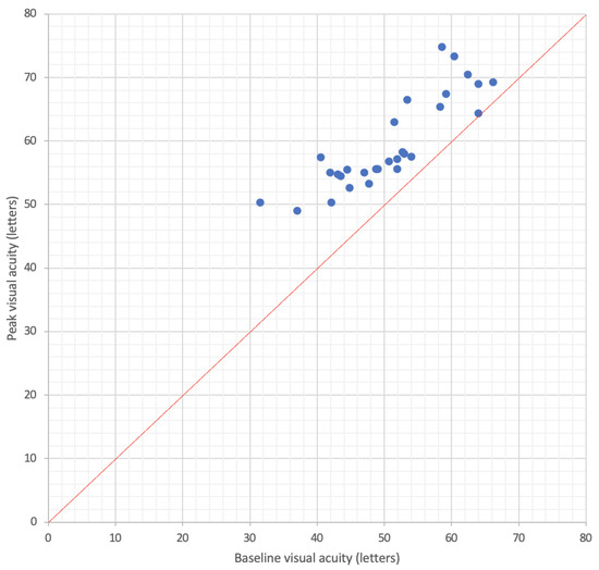 Peak visual acuity as a function of baseline visual acuity in real-world studies evaluating the efficacy of the fluocinolone acetonide implant for diabetic macular edema. Mean follow-up was 20.0 months (n = 22 studies).