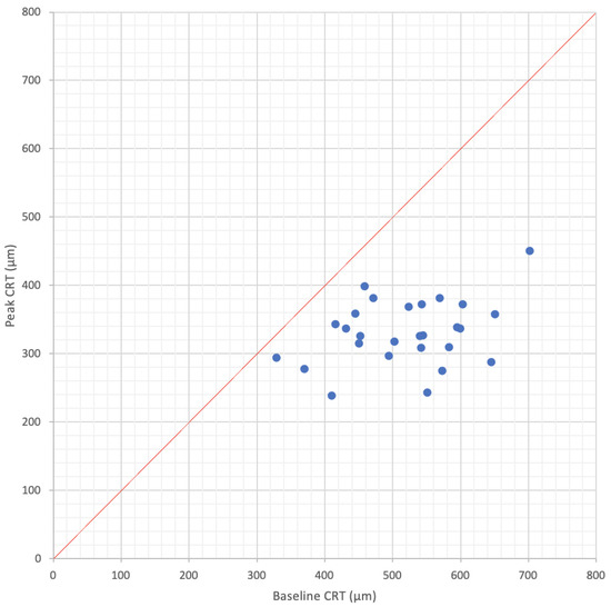 Studies that evaluated the anatomical efficacy of the FAc implant (n = 20 studies) had a mean follow-up of 20.3 months (range: 8.5–36 months, median: 21.0 months) [26,27,28,29,30,32,33,34,35,36,37,38,39,40,41,42,43,44,45,46]. Mean baseline CRT was 516 µm (range: 328–701 µm, median: 532 µm) and decreased to a minimum of 332 µm (range: 237–450 µm, median: 331 µm) after FAc implant injection (Figure 3). Maximum decrease of −34.3% from baseline (range: −10.7–−55.8%, median: −36.2%) was observed at 16.6 months (range: 4.0–36.0, median: 12.0 months). A subgroup analysis of the peak CRT decrease according to baseline CRT is summarized in Table 2b. Greater percentage of CRT decrease was observed for thicker baseline CRT (−44%) in comparison with thinner baseline CRT (−18%).