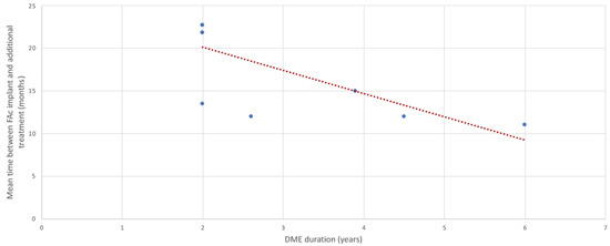 Almost 30.0% of patients (range: 7.0–54.2%, median: 30.9%) needed one or more additional intravitreal DME treatment during the follow-up period. The average duration between treatments post-FAc implant injection was 15.4 months (range: 11.0–22.7 months, median: 13.5 months) and was inversely proportional to the DME duration (Figure 5).
