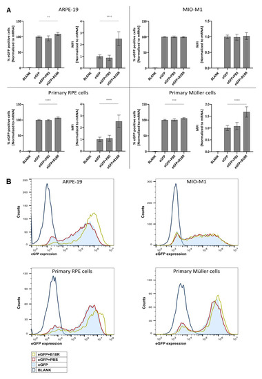 Transfection efficiency of mRNA-MessengerMAX lipoplexes when co-incubated with B18R. (A) Data are expressed as relative percentage enhanced Green Fluorescent Protein (eGFP) positive cells and relative Mean Fluorescence Intensity (MFI) both normalized to the average value of the control group which received only mRNA-MessengerMAX complexes (eGFP) (n = 3 × 3). Other samples represent untreated cells (Blank) or cells co-incubated with Phosphate-Buffered Saline (eGFP + PBS) or B18R (eGFP + B18R) during transfection. Mean absolute % of eGFP positive cells for the control group was 81%, 85%, 85% and 79% for the ARPE-19 cells, MIO-M1 cells, primary bovine RPE cells and primary bovine Müller cells respectively (** p < 0.01; *** p < 0.001; **** p < 0.0001). (B) Data represented as histograms obtained by flow cytometry.