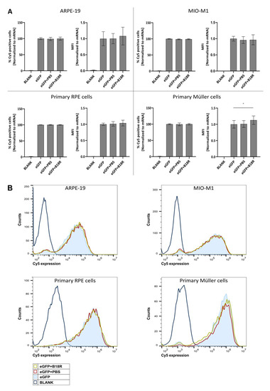 Uptake efficiency of mRNA-MessengerMAX complexes when co-incubated with B18R. (A) Data are expressed as the relative percentage of Cy®5 positive cells and relative MFI both normalized to the average value of the control group which received only mRNA-MessengerMAX complexes (eGFP) (n = 3 × 3). Other samples represent untreated cells (Blank) or cells co-incubated with PBS (eGFP + PBS) or B18R (eGFP + B18R) during transfection. Mean absolute percentage of Cy®5 positive cells was 84%, 96%, 95%, 98% for the ARPE-19 cells, MIO-M1 cells, primary bovine RPE cells and primary bovine Müller cells respectively (* p < 0.05). (B) Data represented as histograms obtained by flow cytometry.