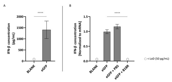 As depicted in Figure 3A, transfection of ARPE-19 cells with mRNA led to an extensive IFN-β production. More specifically, this resulted in a concentration of ~1409 pg/mL IFN-β in the supernatant of the cells. This confirmed that unmodified mRNA is indeed immunogenic and can hence efficiently trigger innate immune responses. However, possible partial immune stimulation by the carrier itself should also be taken into account. As displayed in Figure 3B, co-administration with B18R resulted in a spectacular drop in IFN-β concentration. In fact, the IFN-β concentration was lower than the limit of detection (LoD) of the ELISA assay. Since the control groups receiving PBS instead of B18R showed a small but significant increase in IFN-β concentration, we can guarantee that the decrease in IFN-β concentration is not owing to the B18R solvent.