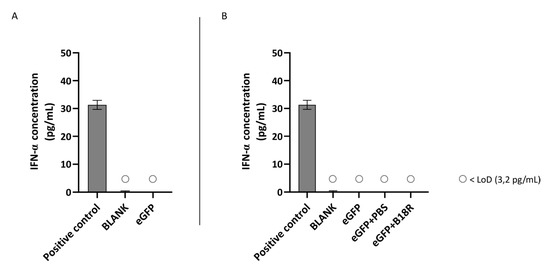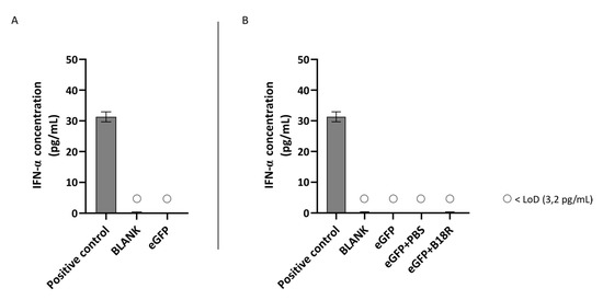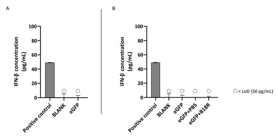 In contrast to the ARPE-19 cells, IFN-β production could not be induced by addition of mRNA-MessengerMAX lipoplexes to the MIO-M1 cells. Evidently, we could also not observe a decrease in IFN-β concentration after addition of B18R to the cells. All values of both control groups and test groups were lower than the LoD of the ELISA assay as depicted in Figure 4.
