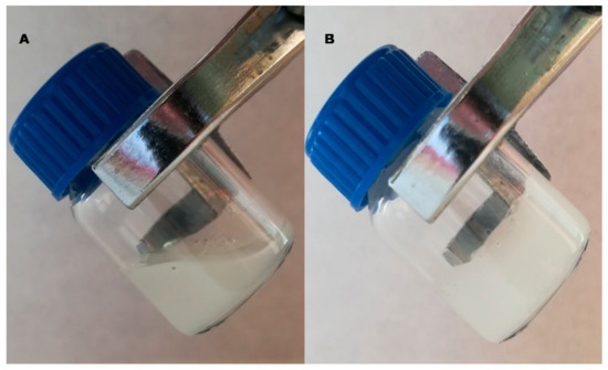 The sol/gel transition temperature and time was assessed in triplicate by the measurement of time and temperature at which a magnetic bar stopped moving owing to gelation. For this task, a 10 mL sample was put into a transparent vial containing the magnetic bar at constant rotation speed of 400 rpm in a magnetic water bath from 4 to 37 ± 0.1 °C.
