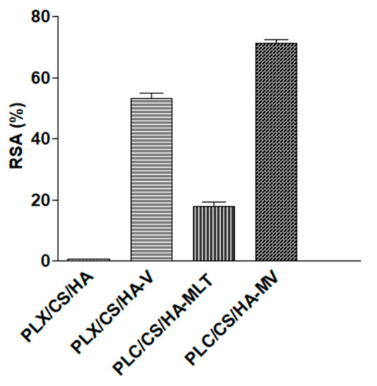 The radical scavenging activity of blank PLX/CS/HA, PLX/CS/HA-V, PLC/CS/HA-M and PLX/CS/HA-VM was tested by measuring their capacity to scavenge the stable 1, 1-diphenyl-2-picrylhydrazyl (DPPH, Sigma-Aldrich Chemie, Steinheim, Germany). For this task, each hydrogel was prepared by taking 500 µL of the formulation and 1500 µL of the DPPH ethanolic solution. The reaction mixtures were shaken vigorously and then kept at 30 °C. Their absorbances were recorded in triplicate spectrophotometrically with the method of a slightly modified test of Brand-Williams [44] at 515 nm on a Spectronic Genesys 8 UV/Vis spectrophotometer (Fisher Scientific, Rochester, NJ, USA).