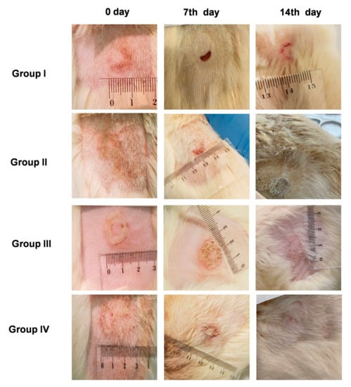 Wound healing evolution for 14 days in animals with no treatment (Group I), treated with PLX/CS/HA (Group II), treated with PLX/CS/HA-VM (Group III), and animals treated with the commercial reference silvederma® (Group IV).