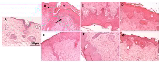 Histology of skin; (A) healthy skin; (B) burned skin without treatment; (C) skin treated with PLX/CS/HA; (D) skin treated with PLX/CS/HA-V; (E) skin treated with PLX/CS/HA-M; (F) skin treated with commercial reference; (G) skin treated with PLX/CS/HA-VM. Hematoxylin and eosin stains nuclei blue/black while keratin and cytoplasm are stained red. The asterisk indicates loss of stratum corneum and the arrow indicates infiltration of inflammatory cells, s = scar. Scale bar = 200 μm.
