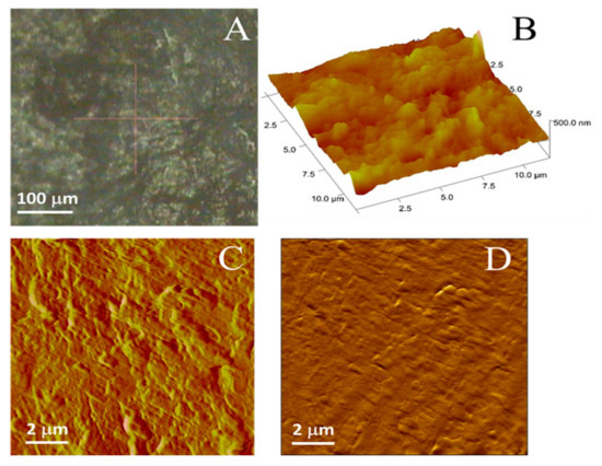 Figure 6 shows representative images of the health of rat skin under study. Figure 6A shows an optical image of clean regions without any detached scales or hair. Brighter zones were preferred over darker ones (intercellular gaps) to avoid any border effect. Figure 6A shows the three-dimensional (3D) topographic view of rat skin surface corresponding to one of the brighter areas displayed in Figure 6A. Some random structures ⁓500 nm wide with mean height values of 50–100 nm can be observed, but no keratin fibrils or organized structures were detected. As the scan size of this image is ⁓15 × 15 µm2, the picture is equivalent to one fraction of the surface of a corneocyte. Furthermore, Figure 6A shows the corresponding deflection AFM image derived from Figure 6B. This image highlights the border of the scanned structures and reveals the roughness due to corneocyte disposition typical of healthy skin [47]. Furthermore, the friction AFM image of skin is shown in Figure 6D to assure the cleanliness of the evaluated sample, from which it can be observed that no changes in color are recorded. This is indicative that no lipids or other contaminants are present in the surface of the skin under study.
