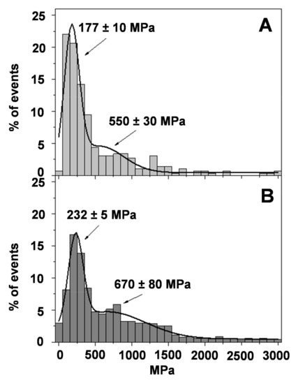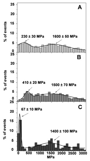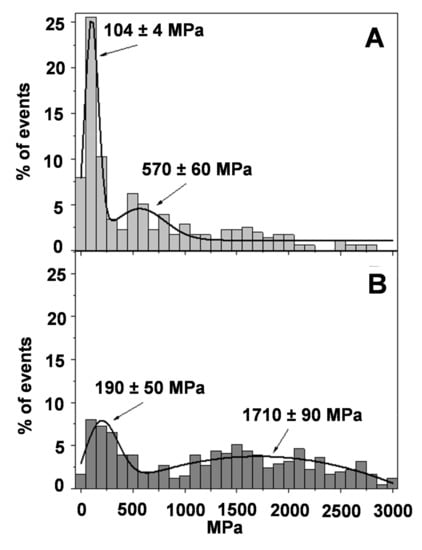 On the contrary, when the rat skin is damaged (Figure 7B), the maximum observed in the natural skin has almost vanished together with a shift towards higher values (190 MPa). The second peak in Figure 7B is also shifted toward higher Young’s modulus values and spread in a wider range of values. Although it is difficult to attribute the peak, the mathematical fitting of the data to a normal distribution centers the peak at 1700 MPa.