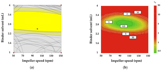 According to the ANOVA results regarding true density, bulk density, Carr’s index, and angle of repose, the p-values of all control factors were less than 0.05. The R2 values of the response factors (q7–q10) were 0.8815, 0.9171, 0.9937, and 0.9870, respectively, which indicates that the control factors had a significant effect on the response factors. According to Equation (14), the true density was positively affected by the impeller speed, binder solvent, and interaction between impeller speed and massing time. Bulk density was negatively affected by the impeller speed and binder solvent. If the impeller speed increases, the granule size may increase because granule coalescence and growth may occur [24,41,42,49]. In addition, when many binding solvents are added to the powder bed, strong liquid bridges are formed between the particles, which increases the particle size [41,42]. Larger granules have a lower bulk density than smaller granules because less can fit in the same volume. Therefore, impeller speed and binder solvent can negatively affect bulk density. According to Equation (16), an increase in the binder solvent increases Carr’s index, which results in a decrease in the granule flowability. According to Equation (17), an increase in the binder solvent increases the angle of repose and decreases granule flowability.
