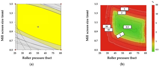 The optimization conditions of the response factors for the roller compaction process were as follows: optimal range of intrinsic dissolution rate (0.0014–0.01847 μg/min/mm2); optimal range of D50 (61.04–68.08 μm); optimal range of a granule size D90 (400–1200 μm); optimal range of D(3,2) (33.2.95.4 μm); optimal range of granule strength (0.0096–0.296 N∙sec); optimal range of dissolution at 5 min (37.5–64.28%); optimal range of dissolution at 10 min (57.43–82.10%). The ribbon density, bulk density, tapped density, granule size D10, granule size(3,2), granule size(4,3), granule uniformity, tablet C.U., dissolution at 15, 30, 45, and 60 min, and contact angle results satisfied both the upper and lower limits of the target value and were excluded from the design space. The response factors were combined to produce a design space with a 95% confidence interval. Figure 2a shows the design space for roller compaction. The yellow area represents the 95% confidence interval. To evaluate the robustness of the design space and the risk of uncertainty in model predictions, a Monte Carlo simulation was conducted using the MODDE® software (Sartorius Stedim Biotech., version 12.0.1, Umeå, Sweden). Figure 2b shows the results of the Monte Carlo simulation with the probability of failure. The green area represents a quality certainty of 99.9%, which suggests a 0.1% probability of failure. In contrast, the red area represents a higher probability of failure. As a result, roller pressure had 99.9% quality certainty in an approximate 45–85 bar range and the mill screen size in an approximate 0.7–1.3 mm range when the roller gap was fixed at 1.8 mm.
