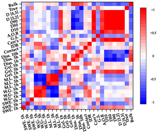 Pearson correlation coefficient analysis was performed to evaluate the correlation among the response factors. The correlation coefficient value ranged from −1 to 1. Each value indicated the following correlations: −1, negative correlation; 0, uncorrelation; 1, positive correlation. Figure 3 visualizes the correlation among the response factors as a heat map. The red color indicates a value of 1, and the blue color indicates a value of −1.