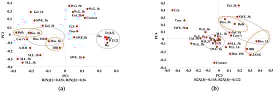 Score scatter plot of high-shear wet granulation: (a) PC1 and PC2, (b) PC3 and PC4. The groups within the gray dotted lines located opposite to each other, indicate a negative correlation. The groups within the orange dotted lines indicate positive correlations with each other. Bulk: bulk density; True: true density: A.O.R: angle of repose; G.S.: granule strength; Carr’s: Carr’s index; IDR: intrinsic dissolution rate; Contact: contact angle; Diss.: dissolution; Gel.: gel strength; M.L.: mass loss; W.G.: weight gain; SWE.: swelling property.